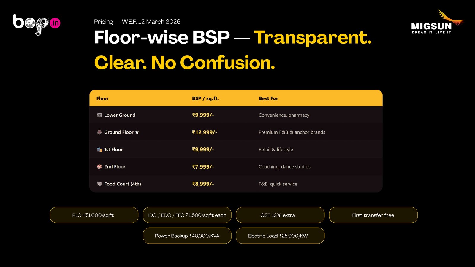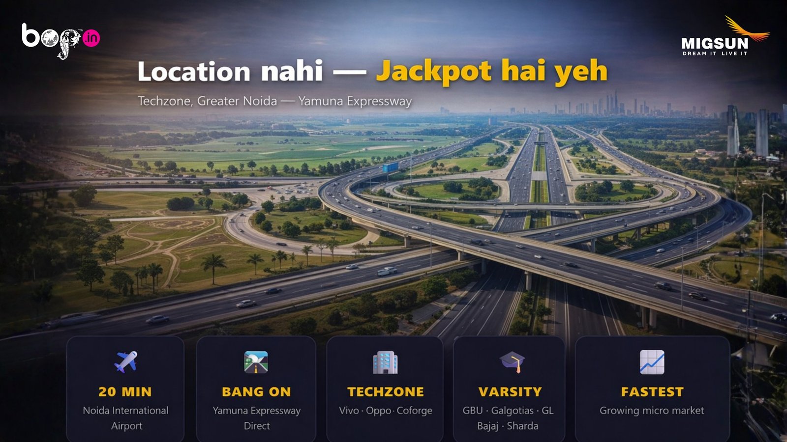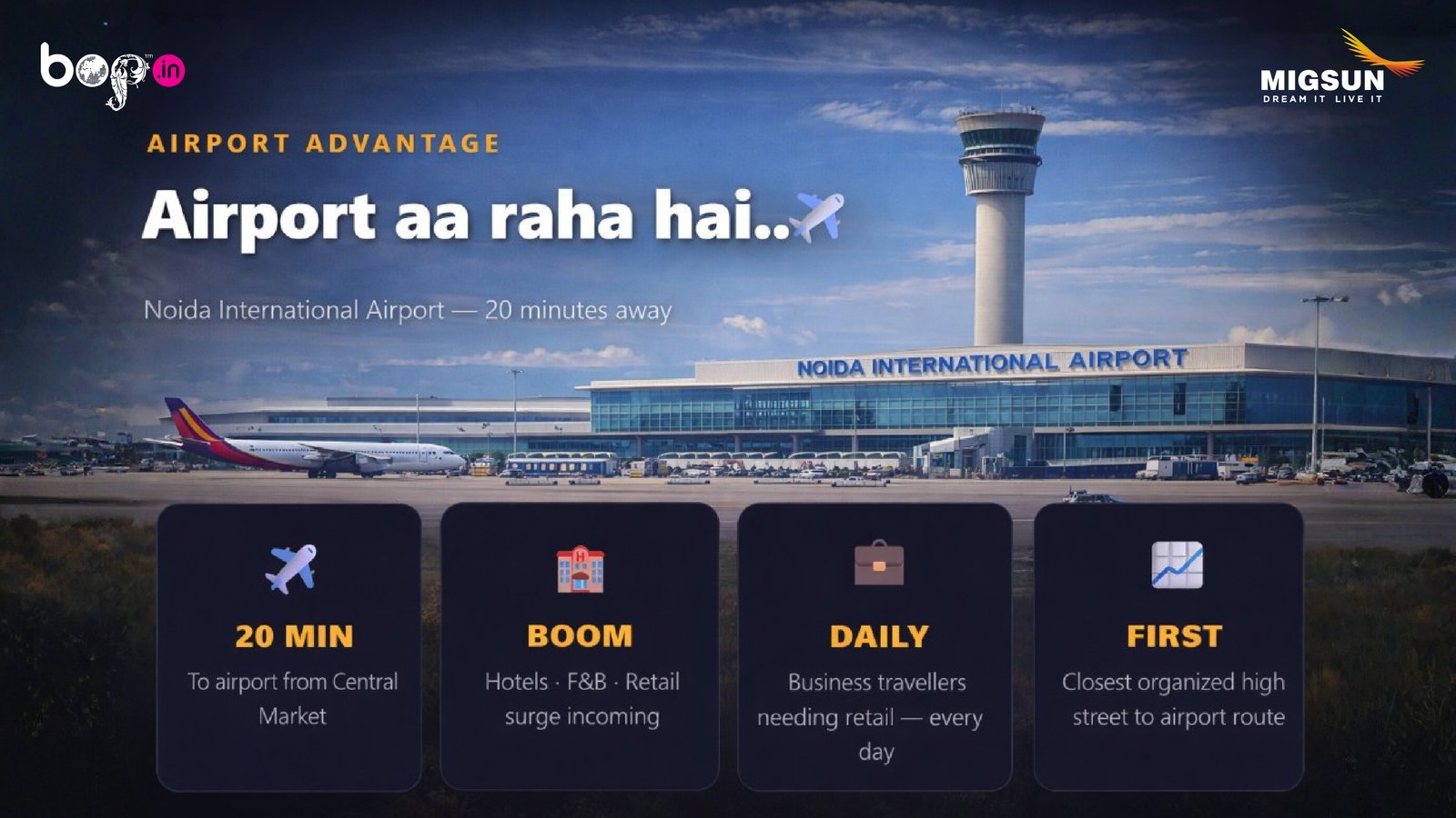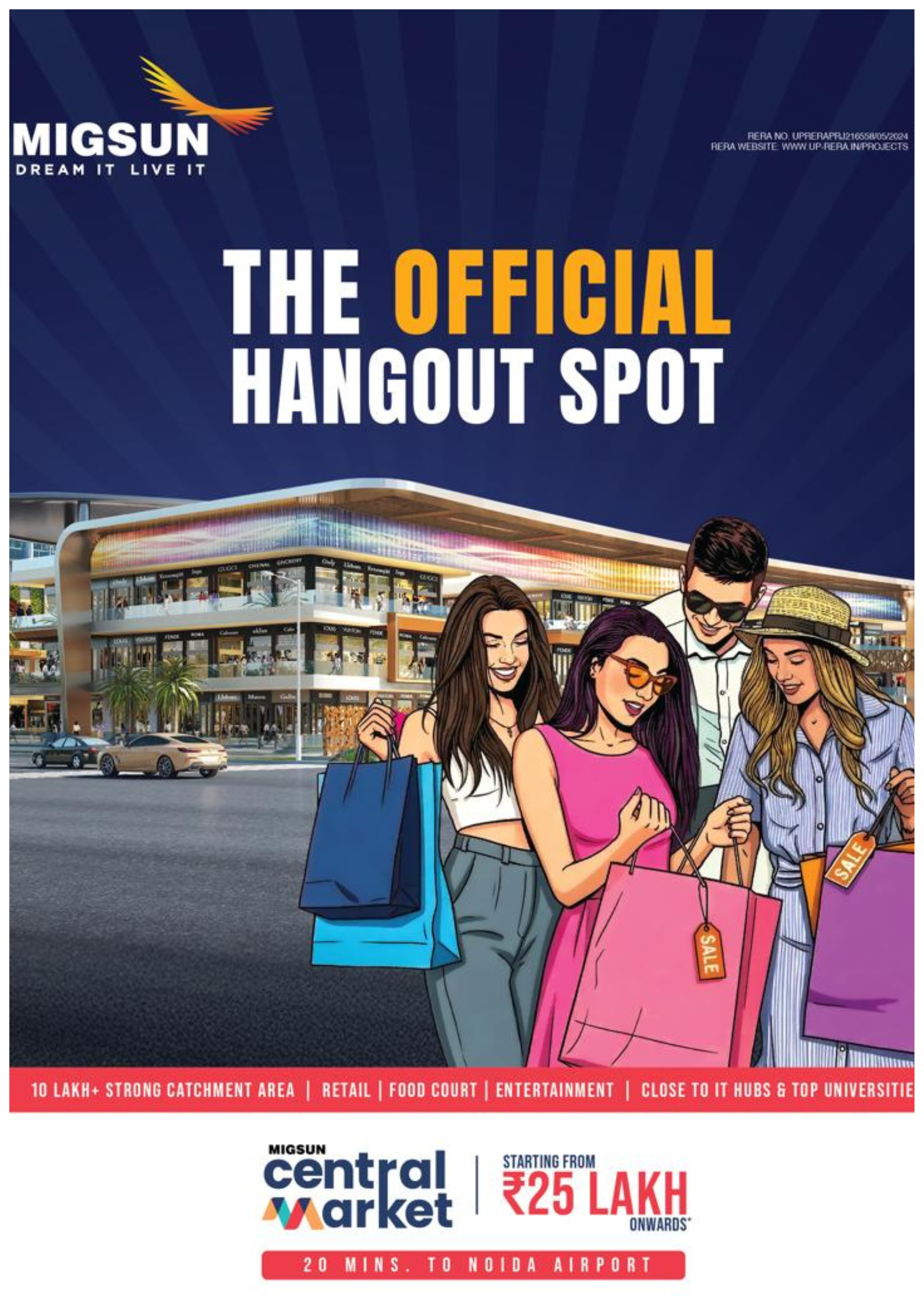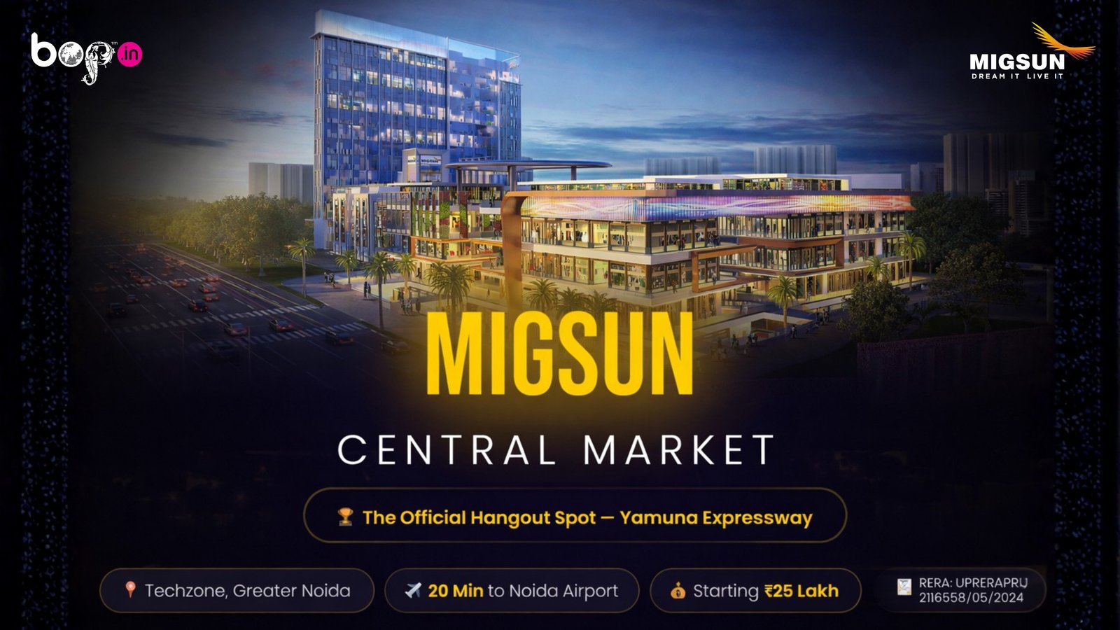 Migsun Central Market is a premium high-street commercial hub on the Yamuna Expressway, strategically located near Noida International University. Designed for high growth and strong returns, it offers a dynamic business environment supported by nearby universities, IT hubs, and residential communities—making it an ideal destination for smart investment and long-term success.