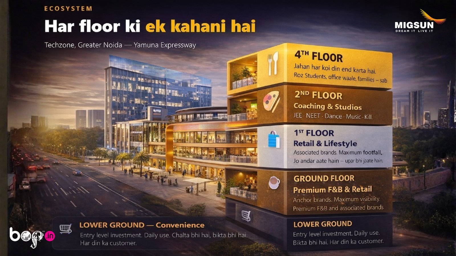 Migsun Central Market is a premium high-street commercial hub on the Yamuna Expressway, strategically located near Noida International University. Designed for high growth and strong returns, it offers a dynamic business environment supported by nearby universities, IT hubs, and residential communities—making it an ideal destination for smart investment and long-term success.